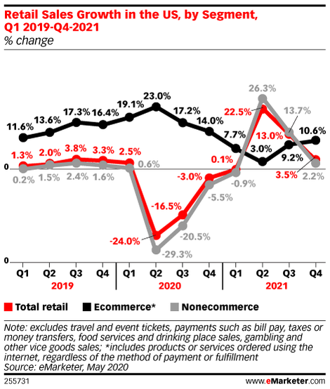 Back in February 2020 (ah, a simpler time), total US retail sales were steadily chugging up a modest incline.  EMarketer had predicted 2.8% growth, which would have been equal to $5.621 trillion in total US retail sales.  It sounded like good news.