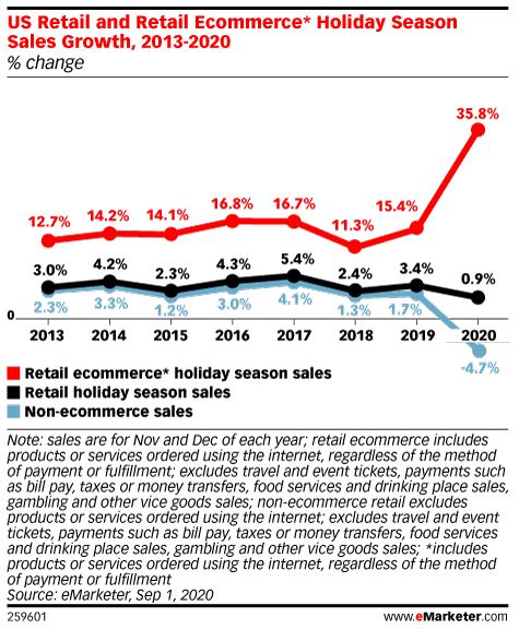 Yet, retailers insist Black Friday is not cancelled. Just because the mad dash likely won’t exist this year doesn’t mean in-store shopping will be nonexistent. As Black Friday is a normal business day, stores may be open. However, we might see stores offering limited-capacity pared-down Black Friday sales — or requiring Black Friday shoppers to register for (or purchase) a time slot to shop. Perhaps there might even be a lottery system where a certain amount of shoppers are allowed to shop in-store at a certain time. Still, total in-store holiday sales will declinefrom 2019 by 4.7%.