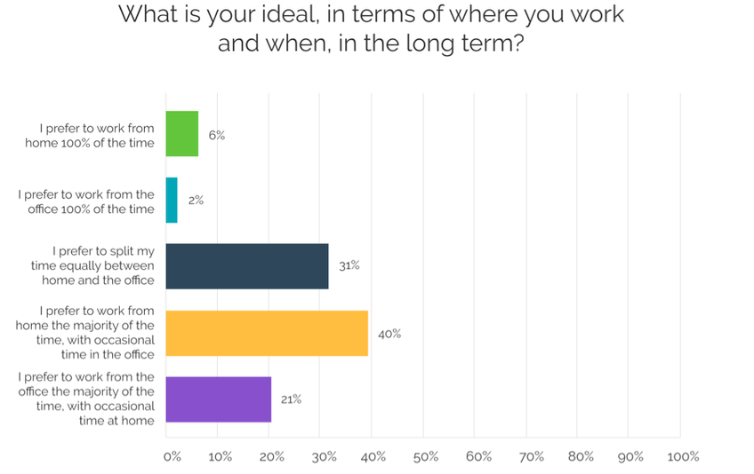 In a recent survey of global workers conducted by Smartway2, only 2% of respondents want to work from the office full-time and only 6% want to work remotely full-time. The great majority of workers (92%) want a hybrid working arrangement, combining work from home and the office.