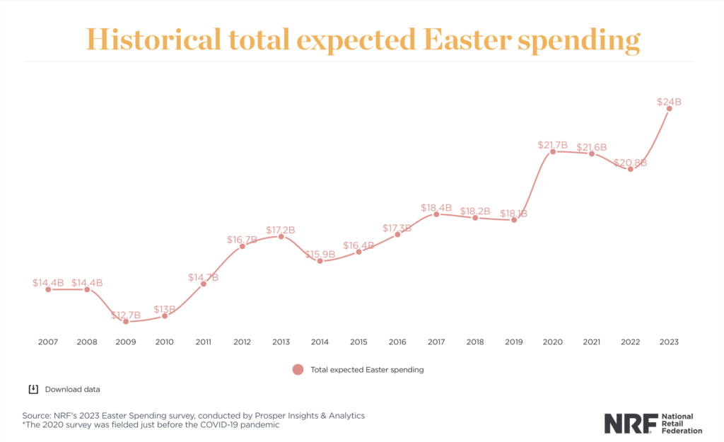 The NRF and Prosper Insights & Analytics estimate that consumers plan to spend a collective $24 billion on Easter this year, up from $20.8 billion in 2022 and the previous record high of $21.7 billion in 2020. Eighty-one percent of Americans will celebrate the holiday and spend an average of $192.01, the highest figure on record.