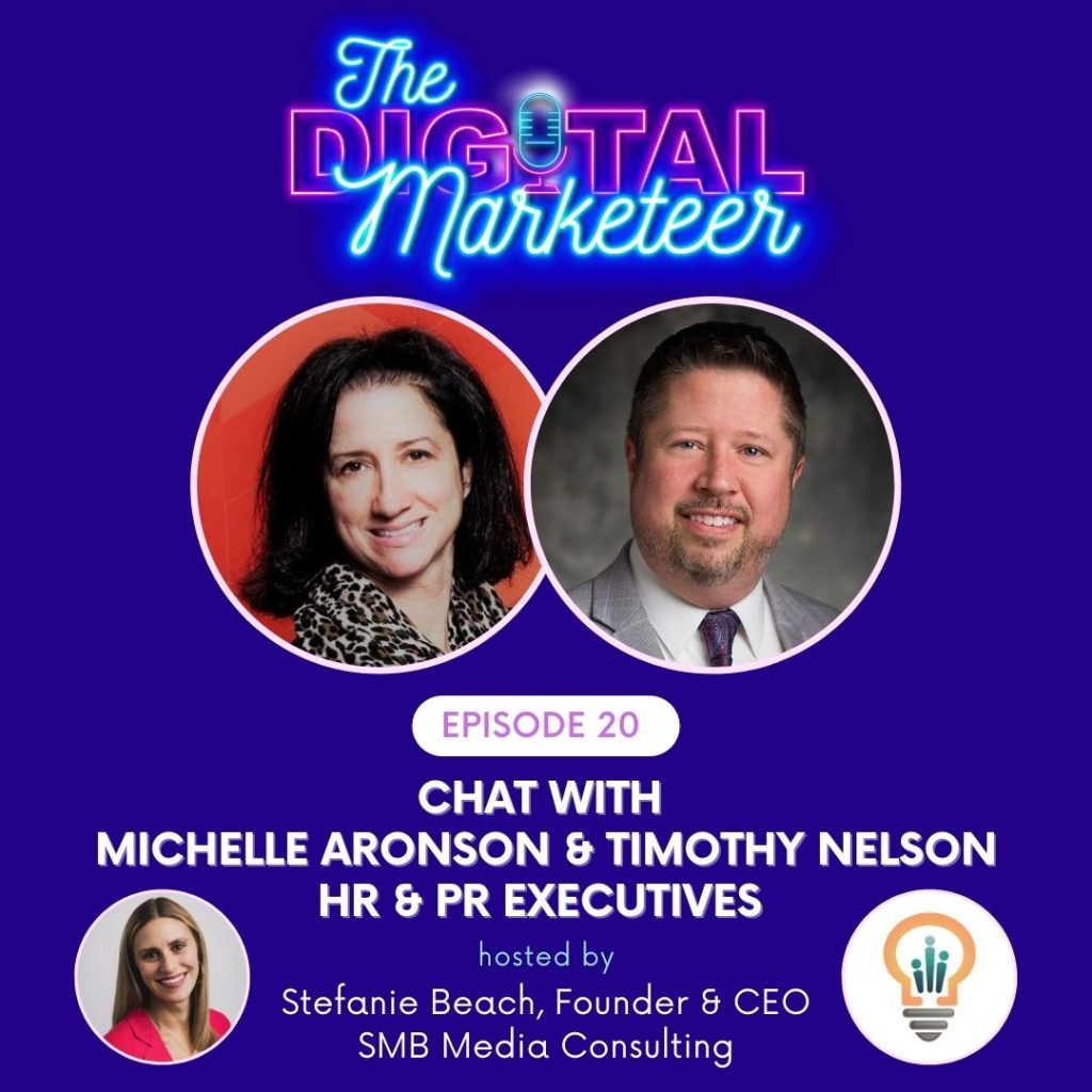 Second-time guest Michelle Aronson is back with former colleague and friend Tim Nelson to speak about their never-dull lives as HR & PR executives. Michelle is an HR/Culture/Leadership professional and Tim is a Public Relations and Communications professional. Join us for a fun and humorous conversation as Michelle and Tim dish out the good, the […]
