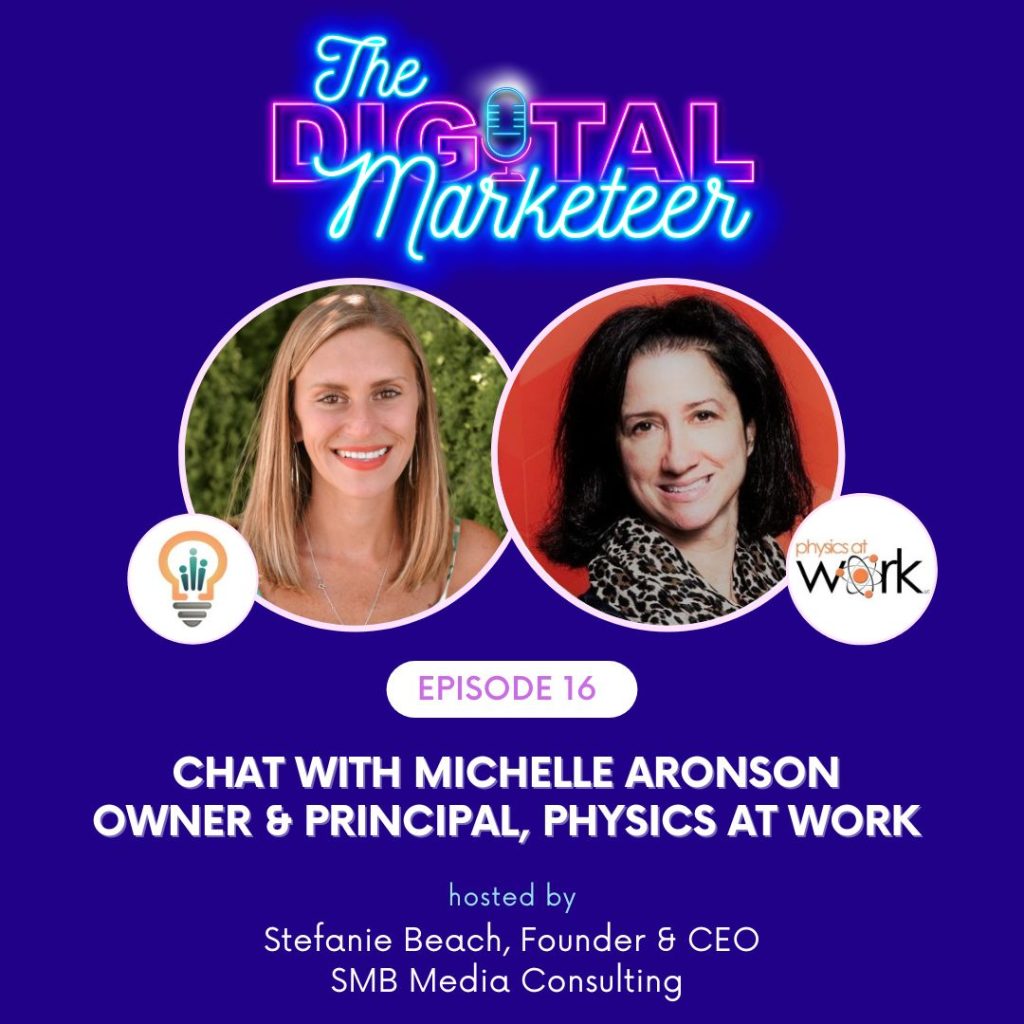 In this episode, Stefanie interviews Michelle Aronson, Owner & Principal of Physics at Work. Michelle is an HR/Culture/Leadership dynamo who talks about her experiences building better workforces with leadership training, coaching and HR strategy. And then the tables get turned as Michelle asks Stefanie some questions of her own!